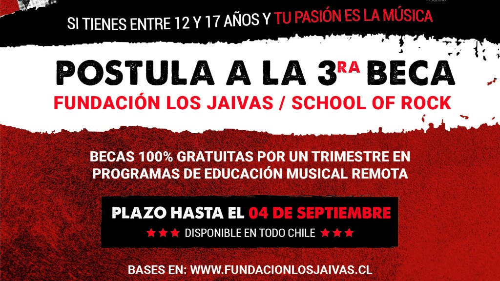 Luego del éxito de convocatoria de sus dos ediciones anteriores, la Fundación Cultural Los Jaivas, junto a la academia internacional de música School of Rock, otorgarán nuevamente una serie de becas para niños y jóvenes músicos del país. Gracias a esta alianza, 16 beneficiados podrán acceder a los programas trimestrales de educación musical impartidos en School of Rock a través de clases remotas.