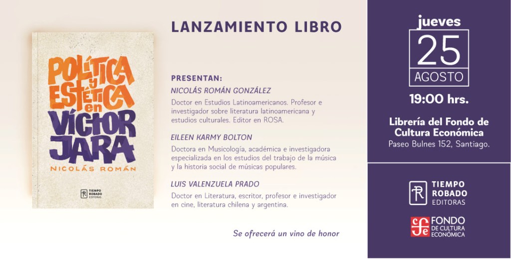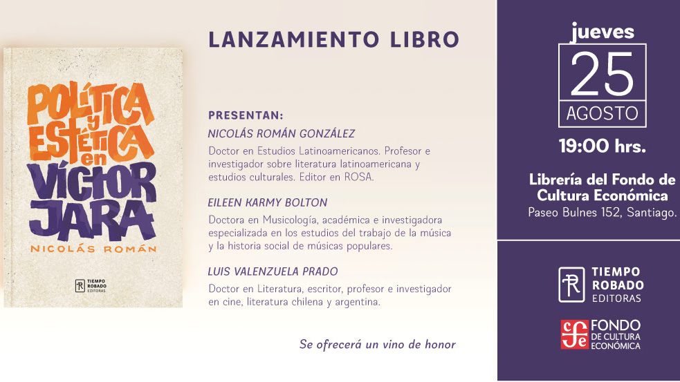 Tiempo Robado Editoras lanzará el libro “Política y estética en Víctor Jara. Su tiempo, trayectoria y legado» de Nicolás Román, licenciado en Letras y Estética y doctor en Estudios Latinoamericanos, el próximo jueves 25 de agosto a las 19:00 hrs. en Librería Fondo de Cultura Económica, ubicada en Paseo Bulnes 152, Santiago.
