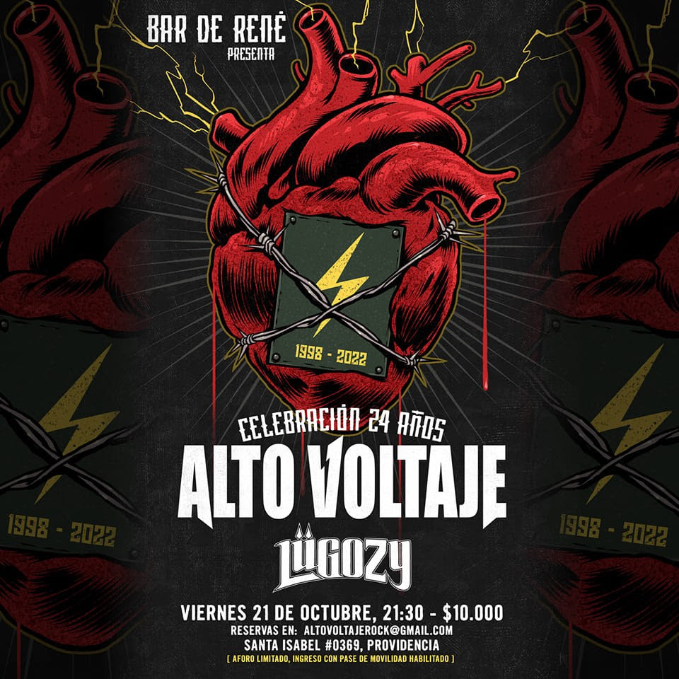 El próximo viernes 21 de octubre a partir de las 21.30 hrs., la legendaria banda Alto Voltaje celebrará sus 24 años de trayectoria, junto a Lügozy, en Bar de René, ubicado en Santa Isabel 0369. Providencia.