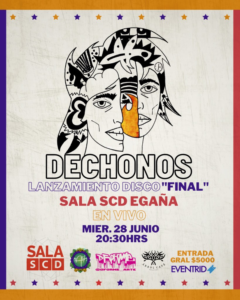 La agrupación chileno.argentina, Dechonos, se presenta el próximo miércoles 28 de junio a las 20.30 hrs. en sala SCD de Plaza Egaña, oportunidad en que estrenará en vivo su cuarto disco «Final». Éste, se encontrará disponible en plataformas digitales desde esa misma fecha.