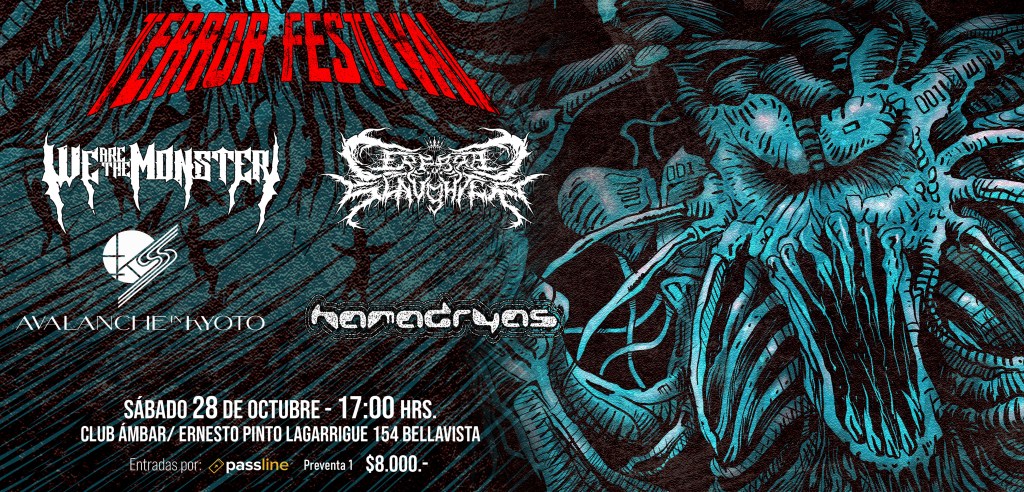 El sábado 28 de octubre , -TERROR FEST- reunirá a las bandas más influyentes y talentosas del género, provenientes de Santiago y Talca, en Club Ambar desde las 17:00 horas. Esta experiencia programada de música está ajustada precisamente para tener en el escenario a bandas como: We Are The Monster, Avalanche in Kyoto, Cerebral Slaughter y Hamadryas; selectivo line up como para ir preparando los oídos.