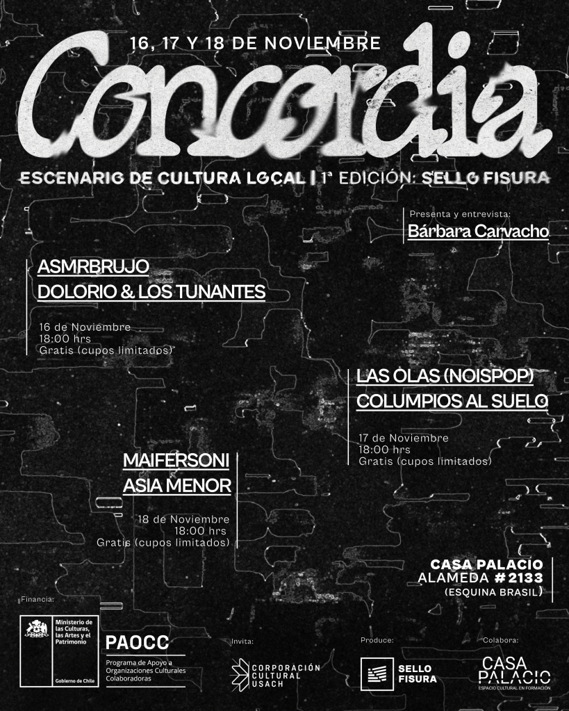 La Corporación Cultural Usach se une a Sello Fisura en Ciclo Concordia, tres fechas musicales gratuitas, a cargo del catálogo de la casa discográfica, dispuestas para la ciudad y sus habitantes. El próximo 16, 17 y 18 de noviembre, viviremos este Escenario de Cultura Local en su primera edición.
