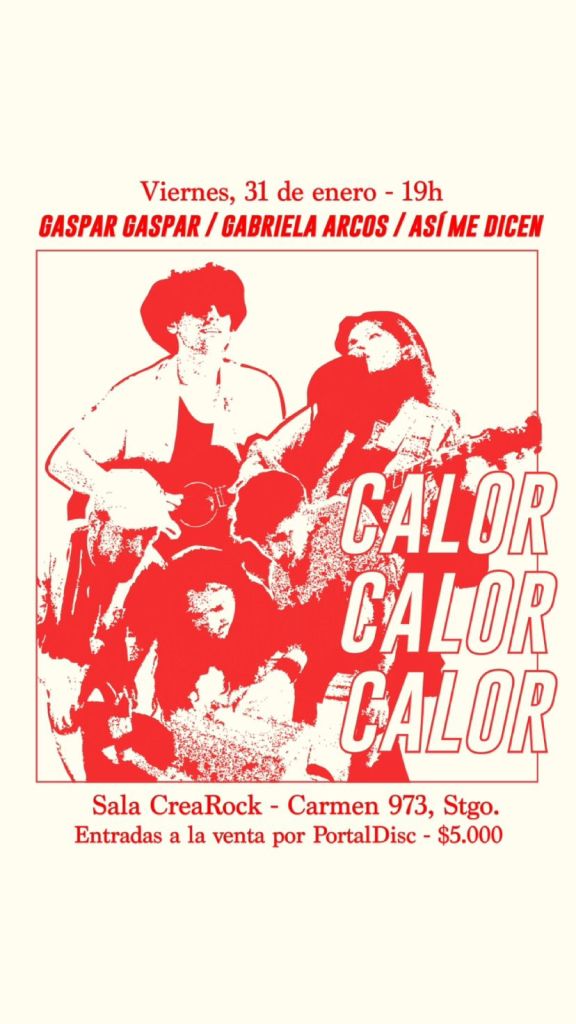 Para quienes pasarán el verano en la calurosa capital, ¡Calor, Calor, Calor! reunirá a Gabriela Arcos, Gaspar Gaspar y Así me dicen se presentarán en la Sala CreaRock este viernes 31 de enero a las 19:00 hrs.