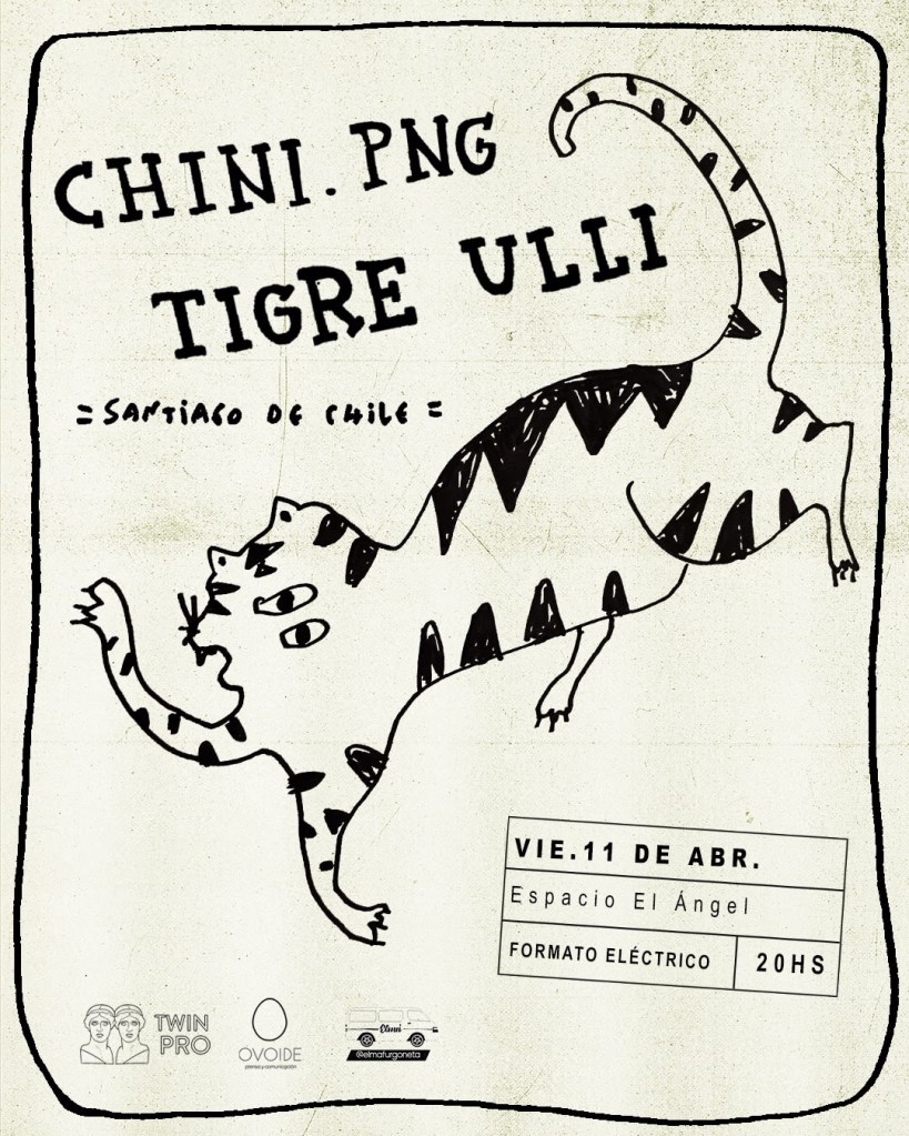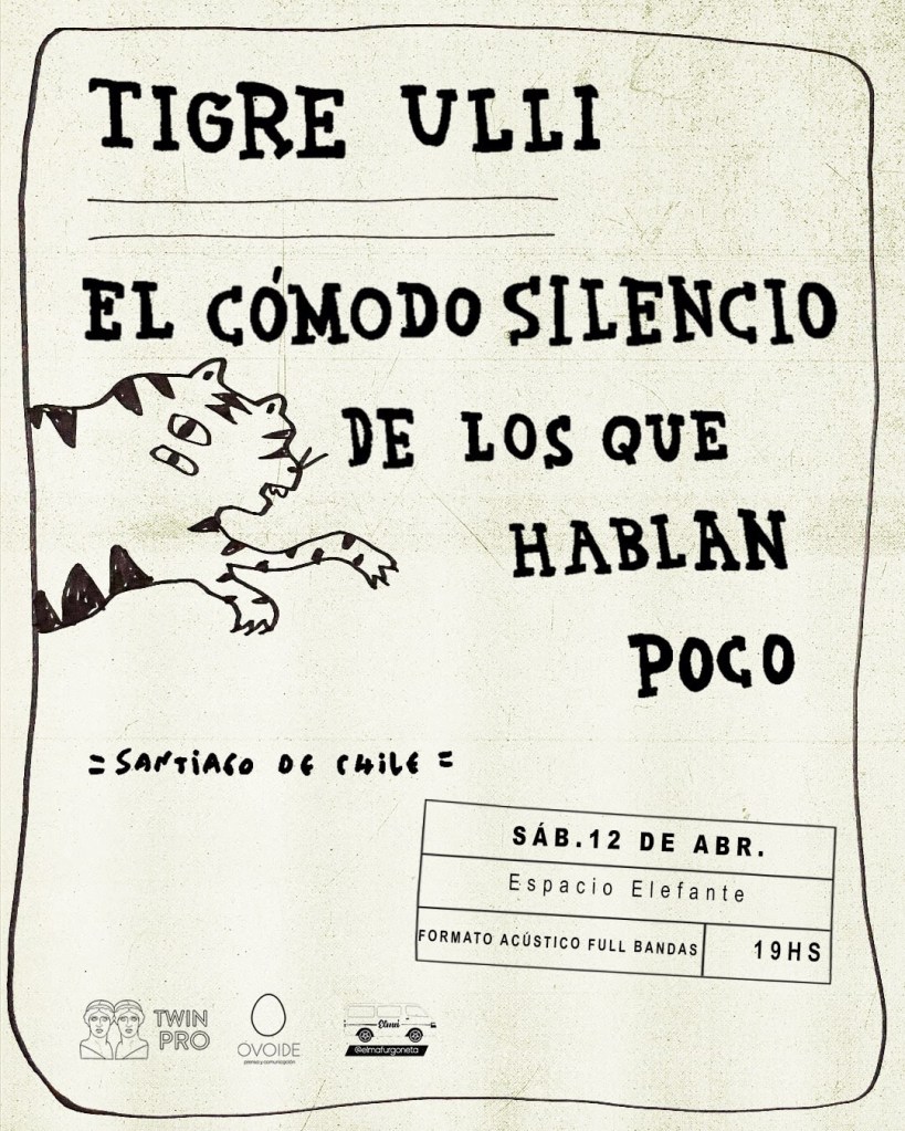 Tigre Ulli confirma dos fechas en Santiago. El viernes 11 de abril, junto a Chini.png en Espacio del Ángel. La segunda pasada será en Espacio Elefante, el sábado 12 de abril con El Cómodo Silencio De Los Que Hablan Poco.