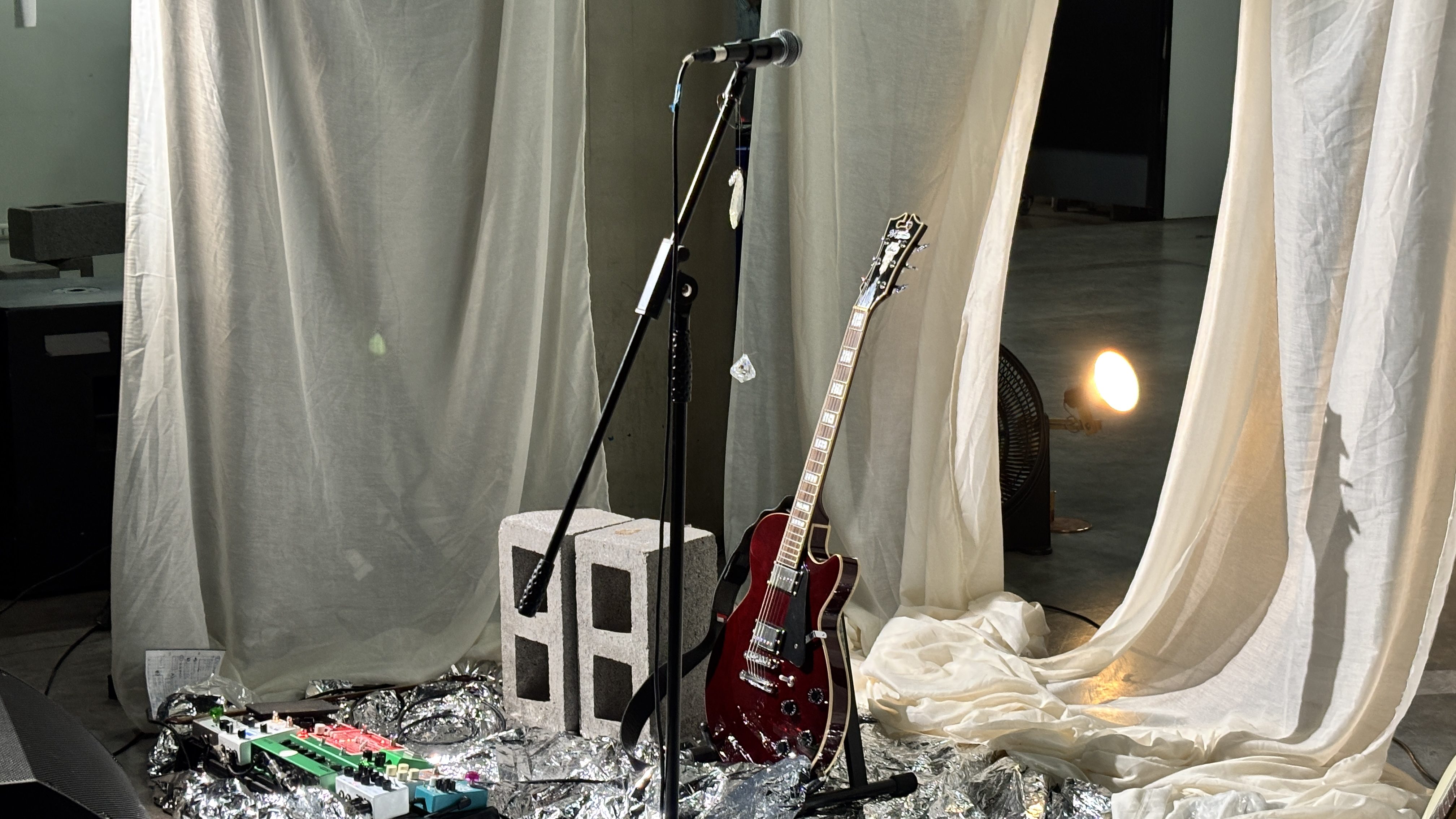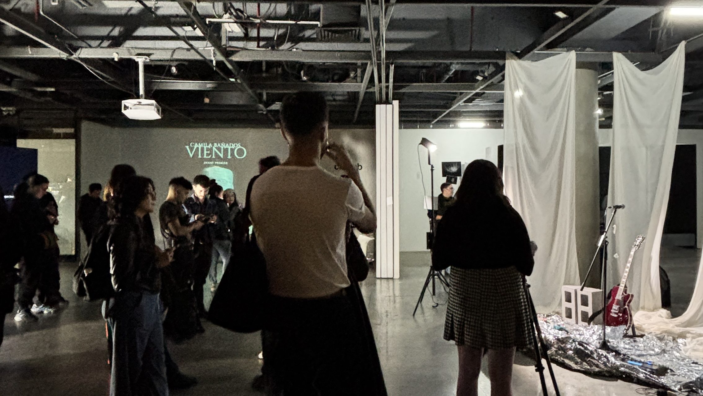 Con una degustación de vinito y una exposición de materiales y vestuario inspirados en el videoclip de Bañados, la espera avivó mi ansiedad social (espacio reducido + gente = cóctel perfecto para que alguien como yo se desequilibre). Pero eso no opacó la belleza del momento: fotos del detrás de cámaras, una pieza de vestuario y un escenario improvisado con telas donde descansaban dos guitarras.