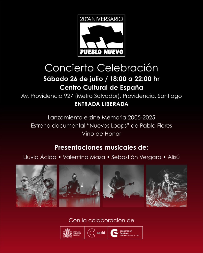 Desde las 18:00 hasta las 22:00 horas, el Centro Cultural de España (Av. Providencia 927, Metro Salvador) será escenario de la Celebración Pueblo Nuevo 20° Aniversario, una cita imperdible para la comunidad melómana y la escena independiente.