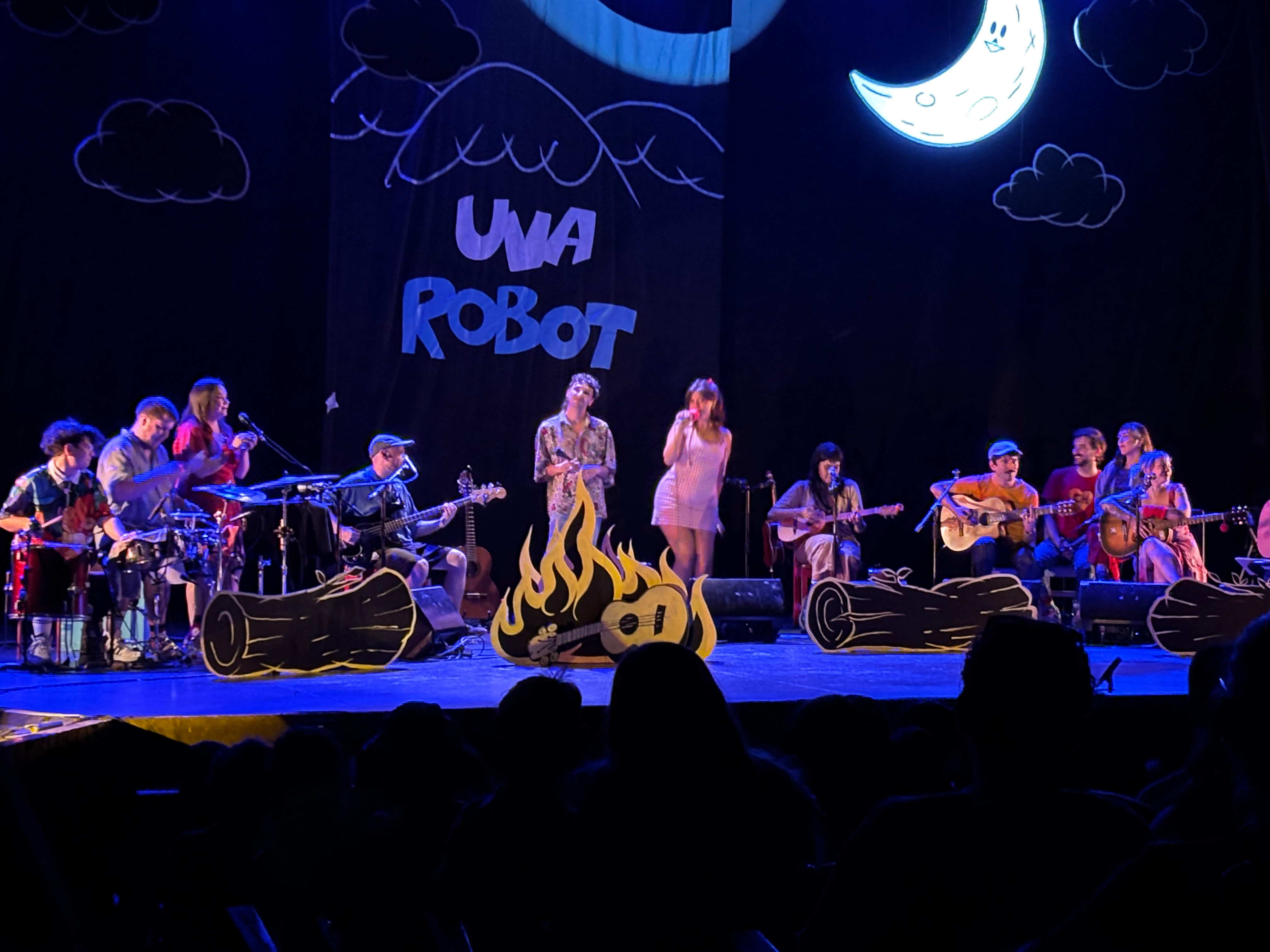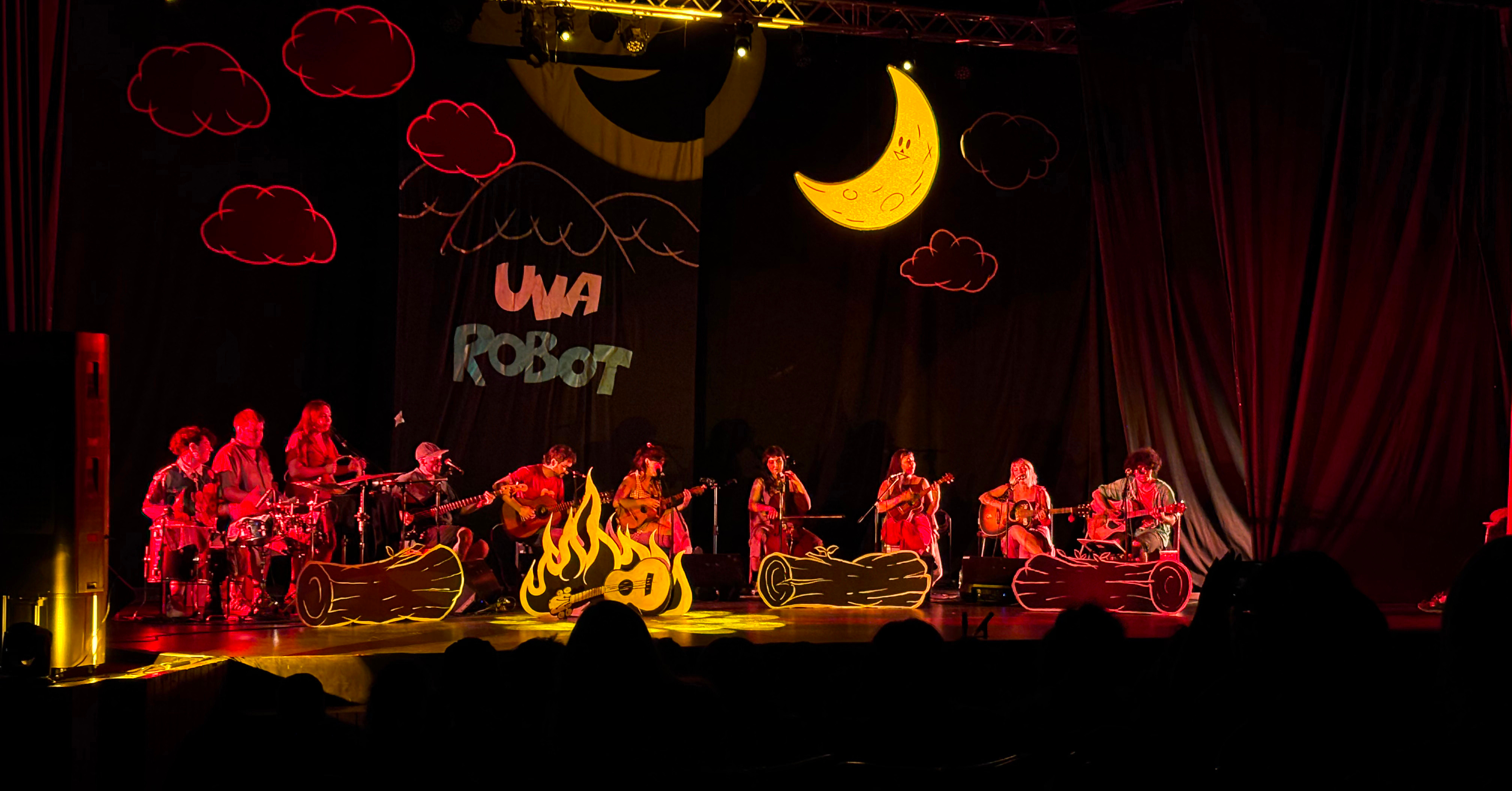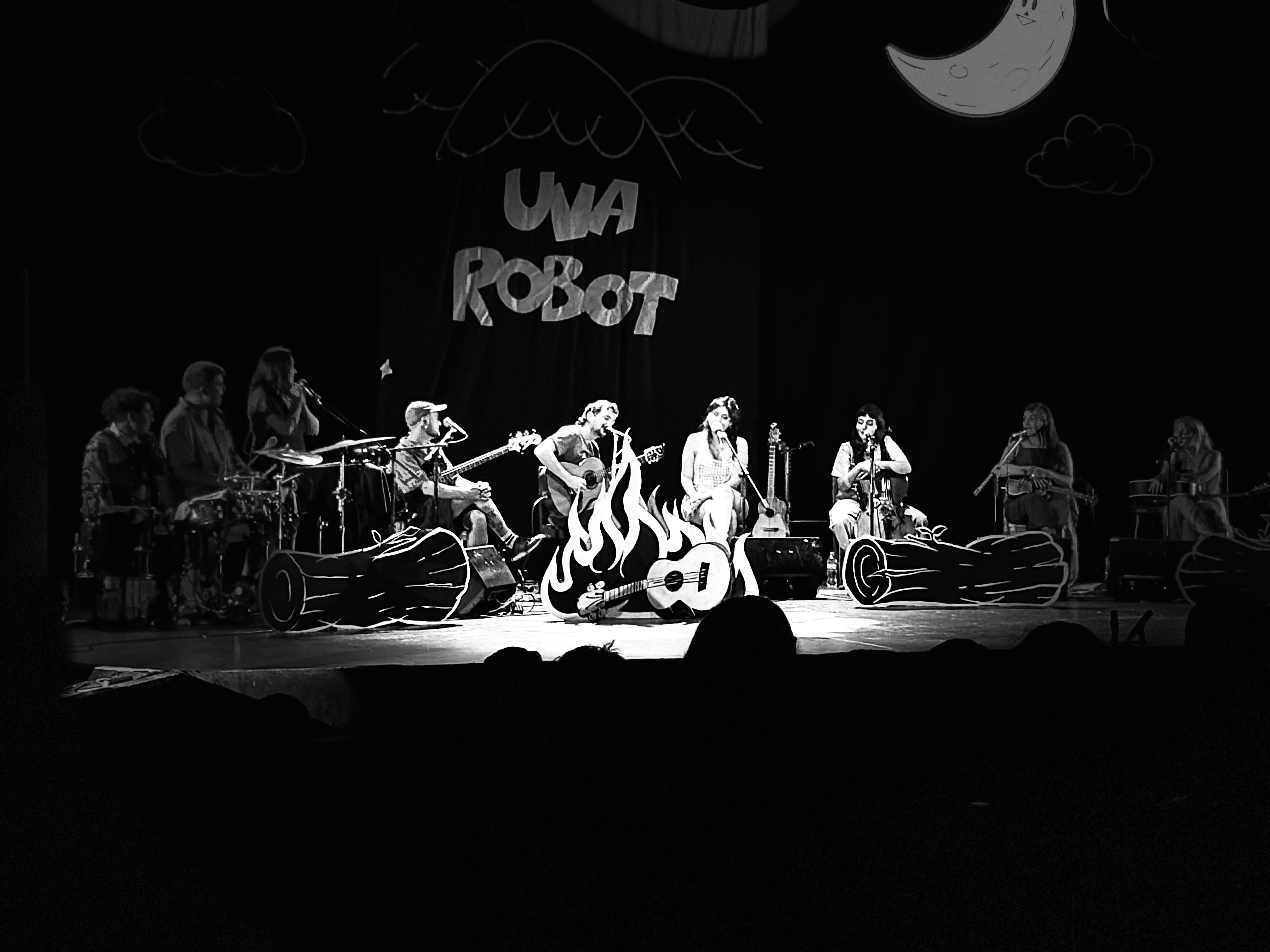 Luego de un breve intermedio, apareció la banda completa. Un ensamble que llenaba el escenario, diseñado como una noche alrededor de una fogata, cobijados por el abrazo de la luna y las estrellas. Una junta de amigxs; una celebración tanto de la música como de la amistad.